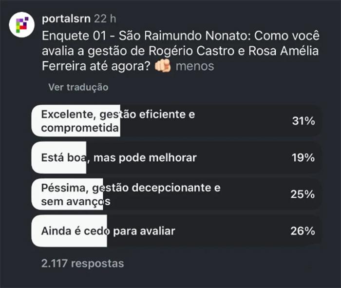 Uma pesquisa popular realizada no Instagram do Portal SRN revelou que a maioria dos participantes aprova a gestão municipal de São Raimundo Nonato -PI comandada pelo prefeito Rogério Castro e pela vice-prefeita Rosa Amélia Ferreira. O levantamento, feito ontem (12), registrou 2.395 interações, sendo 2.117 votos e 228 comentários.